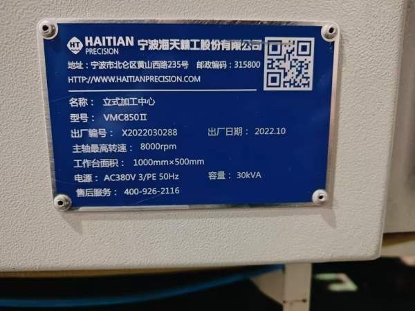 同款两台2022年10月海天精工850加工中心,三菱M80系统,台湾罗翌BT40主轴皮带8000转,台湾冈田24把刀臂式刀库,三轴滚柱线轨, 后排水箱 信息编号:S147782