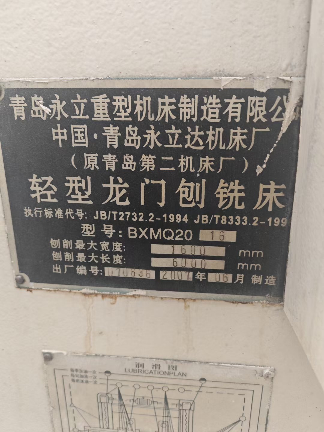 2007年青岛永立BXMQ20-16龙门刨铣,缺刨头,一个侧铣头,一个立铣头,完好可试机,导轨无拉伤。 设备在洛阳 信息编号:S774412