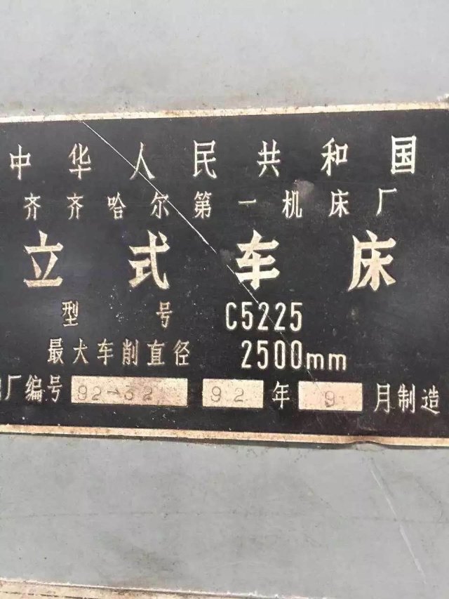 出售齐哈一机产立式车床,1992年设备,型号C5225,最大车削直径2500mm,在位